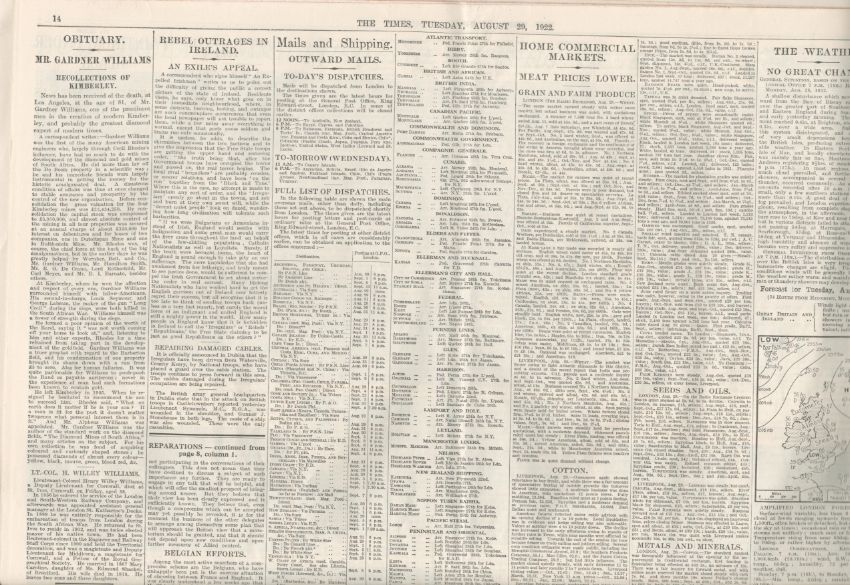 Original Complete Edition of The Times Newspaper 29th August 1922.