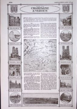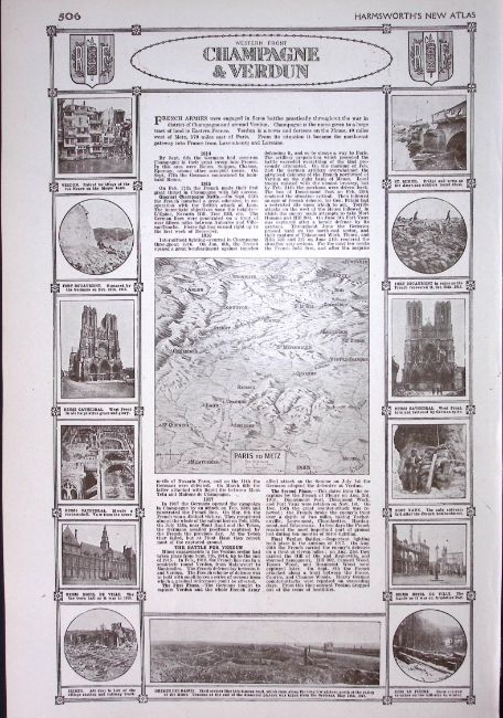 Title: WW1 Battle Lines Western Front Champagne & Verdun Antique Coloured Detailed Map 1922.