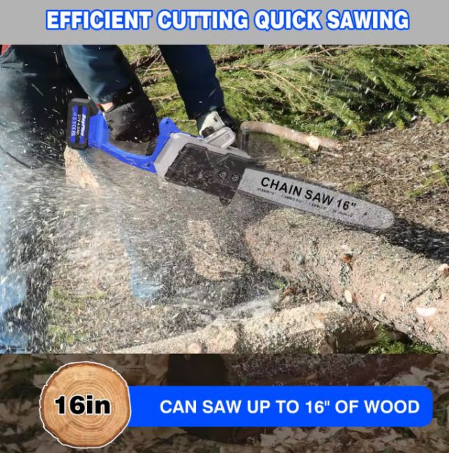 - 16-inch guide bar with high-carbon steel chain – 13m/s cutting speed