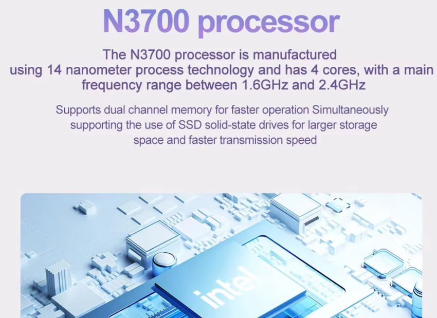 - Processor: Intel Pentium N3700, Quad-Core (Base 1.6GHz / Turbo 2.5GHz)