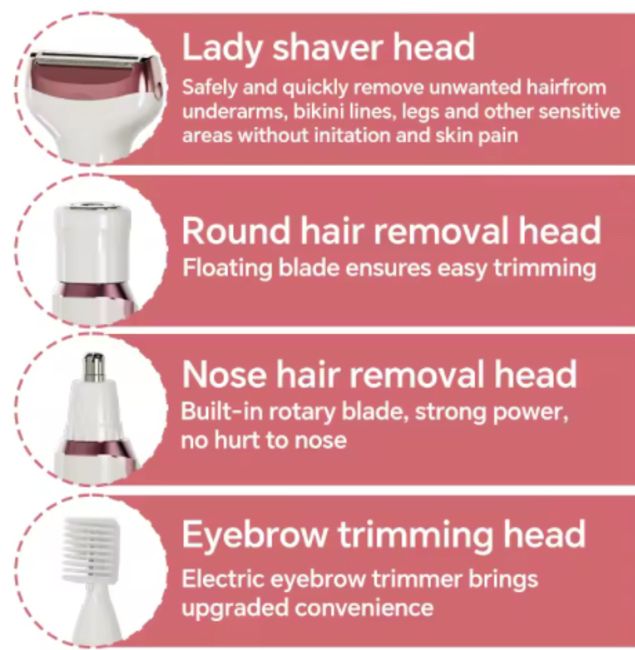 - 4-in-1 grooming kit: face, nose, legs, underarms, bikini line