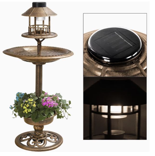 A stylish and practical addition to any garden, this solar lighted bird bath brings together illumination, plant display, and bird-friendly design to create a vibrant outdoor centerpiece.