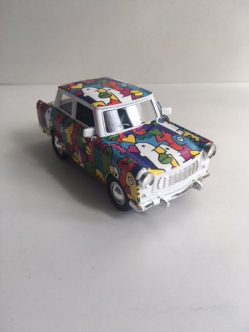 Authorised collectors piece by Thierry Noir & Muddastadt Gmbh Berlin, The Trabant is a 1:39 Scale Model of the original full scale Trabant Car with Pull back and go friction mechanism and decorated by Thierry Noir from his 1984 art invasion of berlin.