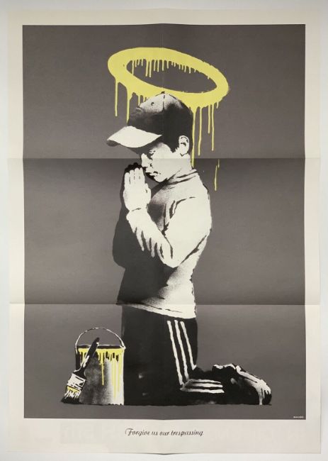 First appeared in 2010 as street graffiti art, the image in Forgive Us Our Trespassing sets aside Banksy’s usual biting satire and derision, revealing instead subtler, more nuanced sentiments. The iconic image of the praying boy kneeling beside a can of paint and a brush first appeared on a wall in Salt Lake City, Utah.