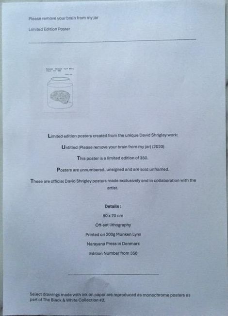 Description – ‘Please remove your brain from my jar’. Shrigley created this limited edition print to encourage joy, thoughtfulness and curiosity in any space, at home or work and for everyone.