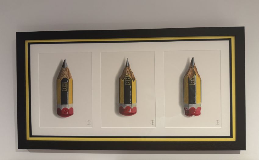 The piece is a triptych, consisting of 3 separate unique artworks by Jamie, with his classic pencil drawings, showing the pencil gradually deteriorating through the stages of use.