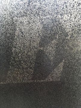 HOPE is a large work on white museum board made using black and blue acrylic paints sprayed over stencils that spell out the title word. The visual appearance of the drawing is in stark contrast to the meaning and associations of its four-letter title.
