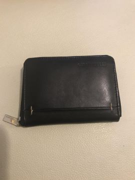Small black leather zip round wallet with inner zip pocket for coins and further compartments for cards etc.