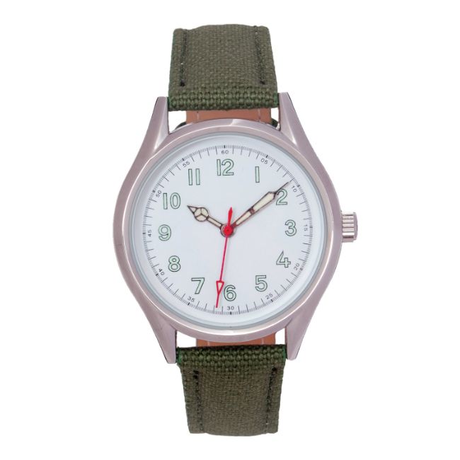 Fastens with a khaki webbing strap and is powered by a quality quartz movement.