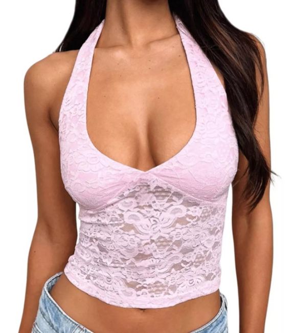 RRP £18.36 Women's Floral Lace Sheer Halter Tie Top
