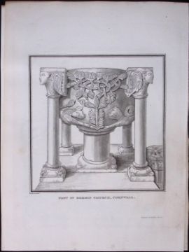 Title: Cornwall Bodmin Church Font Rare Antique Copper Plate Etching By S Lyons