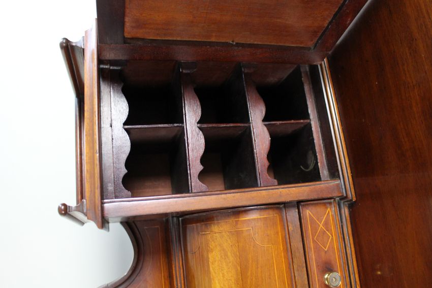 The superstructure is fitted with a central compartment flanked by two cupboards, each door decorated with classical urn inlay and opening to reveal fitted pigeonholes with shaped fronts.