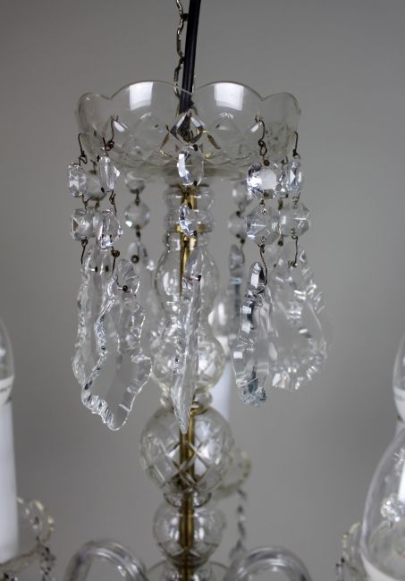 The chandelier is fully dressed with fine quality cut glass throughout: faceted rosettes, button chains, pear-shaped pendants and rule-cut icicle prisms.