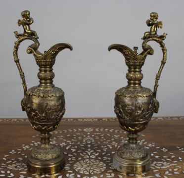 Title: Pair of 19th Century French Gilt Bronze Bacchanalian Ewers with Cherubs