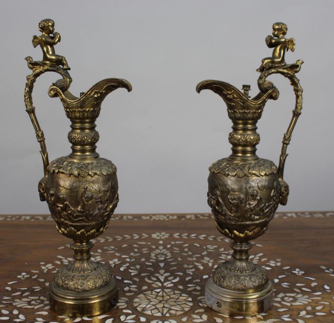 Originally made as decorative bronzes, the ewers were later adapted for use as lamp bases, with threaded fittings and drilled lower sections.
