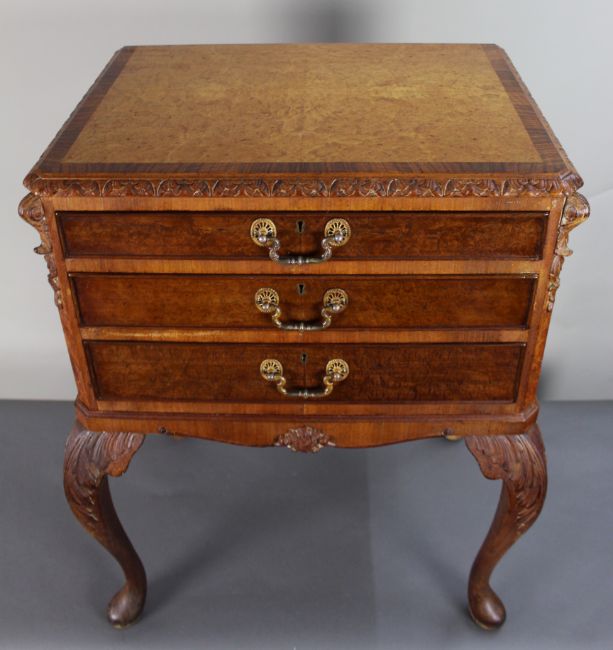 Veneered in figured walnut, with a burr walnut top bordered by crossbanding.
