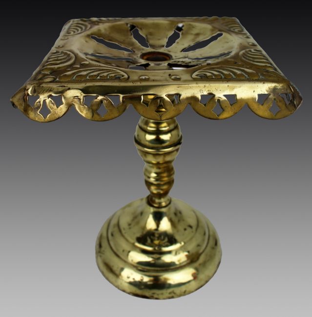 The square top is attractively pierced with a radiating foliate design and scrolled corner motifs, bordered by a scalloped edge with repeating cutwork details.