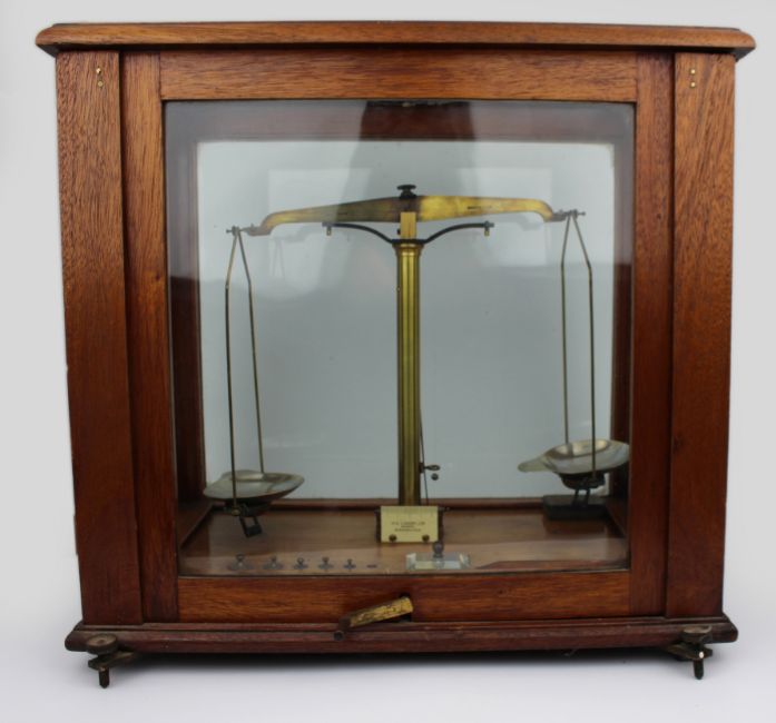 A finely crafted analytical balance by W. & T. Avery Ltd, Birmingham, housed in its original glazed oak case with bevelled glass panels to all sides including the top.