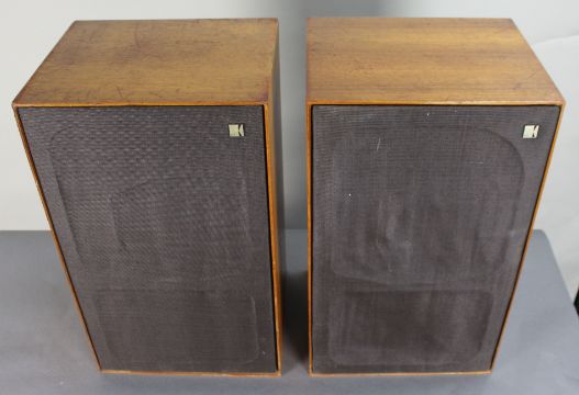 Each speaker is housed in a rectangular cabinet with original cloth grille and KEF badge.