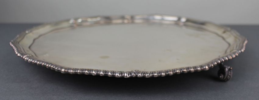 The tray has a shaped outline with a gadrooned and scroll-moulded rim and is raised on three scroll feet.
