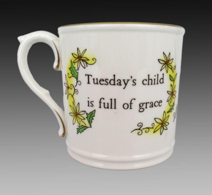A matching pair of mid-20th century Royal Worcester bone china nursery tankards, hand-decorated with verses from the traditional Monday’s Child nursery rhyme.