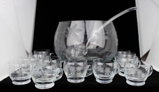 Title: Vintage Etched Crystal Punch Bowl, Ladle & 12 Glasses