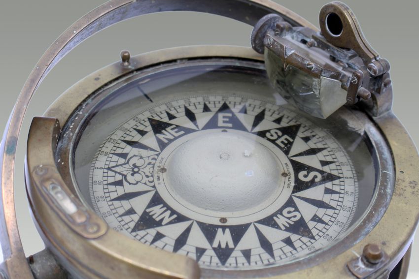 The compass features a silvered dial marked with the maker’s name and bold black and white cardinal and intercardinal points.