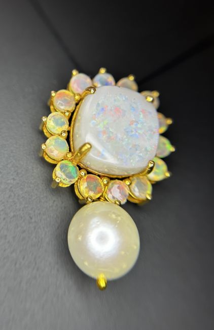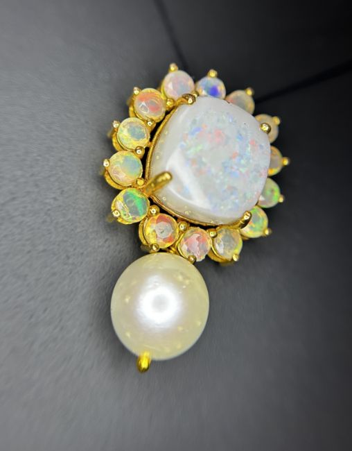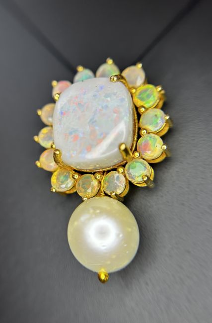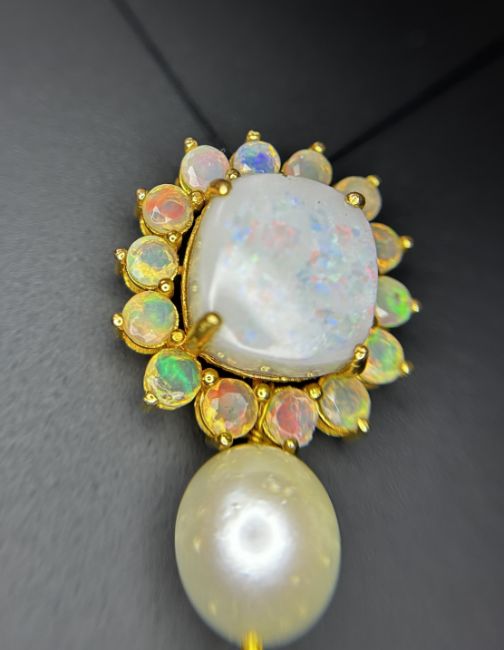 Title: Beautiful 24.50ct Natural Australian Opal and Southsea Pearl Pendant & 18k Gold