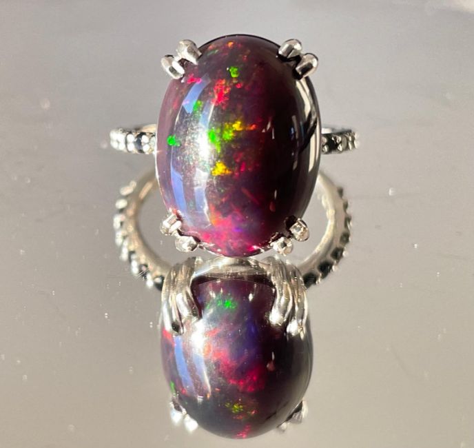 Title: Beautiful Natural 7.66Ct Black Opal Ring With Natural Black Diamonds and 18k Gold