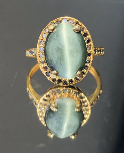 Beautiful Natural 3.05ct Cat’s Eye Ring With Natural Black Diamonds and 18k Gold
