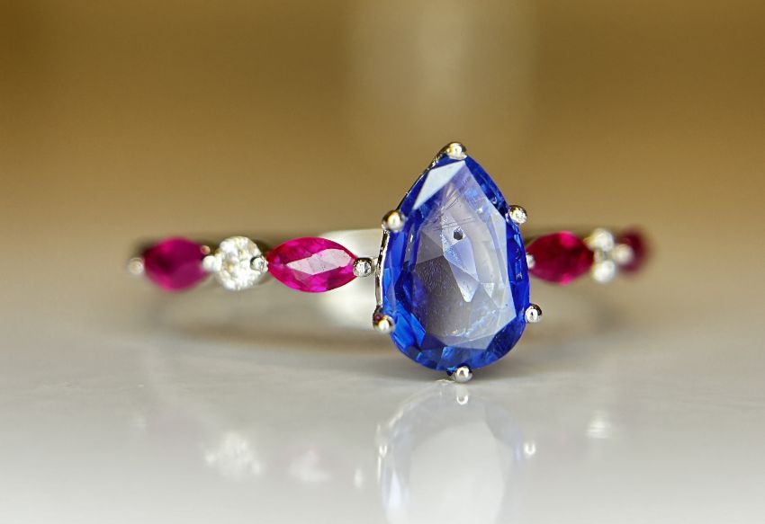 Title: Beautiful 1.06 CT Unheated Burma Blue Sapphire With Burma Ruby, Natural Diamonds & 950 Platinum