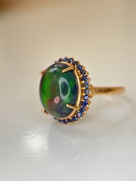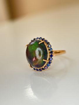 Title: Beautiful Natural 3.40Ct Black Opal Ring With Natural Blue Sapphire and 18k Gold