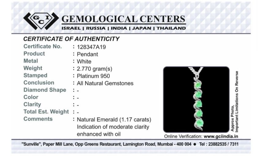 Title: Beautiful 1.17ct Natural Emerald Pendant With Platinum 950