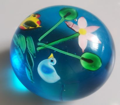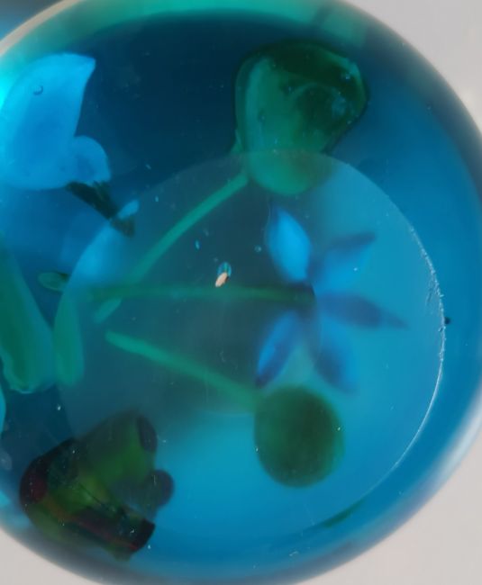The paperweight features a precision-ground, flat, polished base that allows it to sit securely on a desk or shelf. Looking through the bottom reveals the internal glasswork structure.