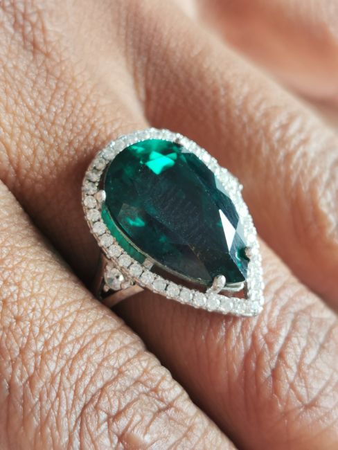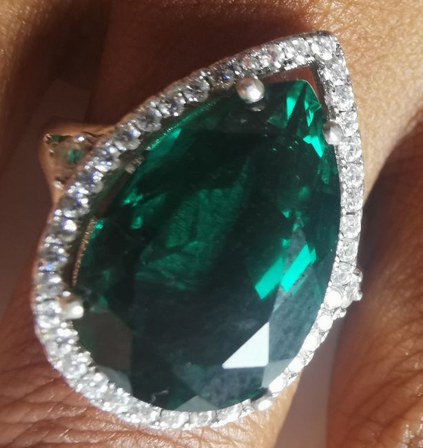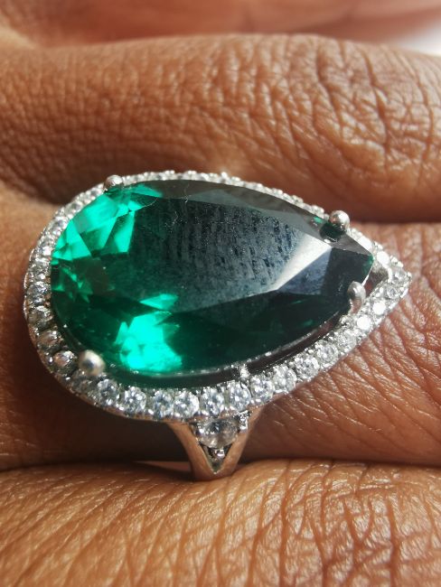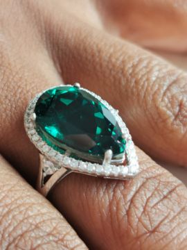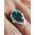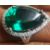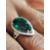 It features a large, faceted oval green stone (resembling an emerald) set in a classic silver band.