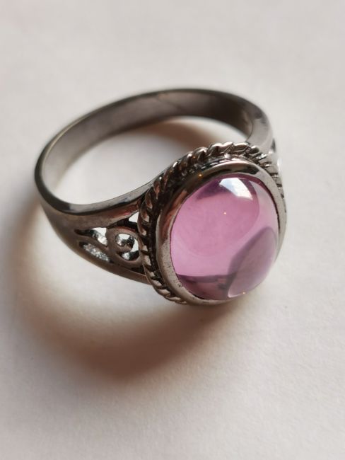 The stone’s soft pink hue and rounded shape give it a classic, elegant look.