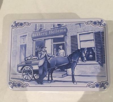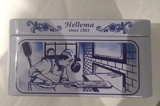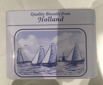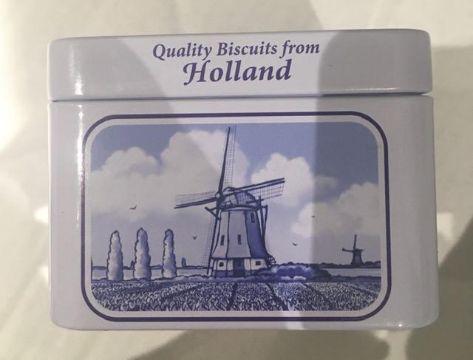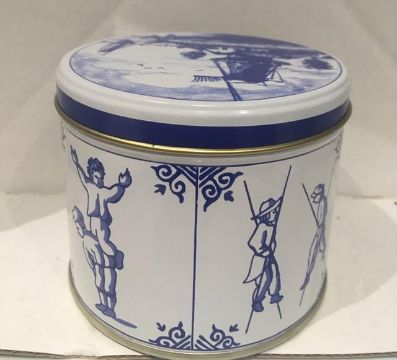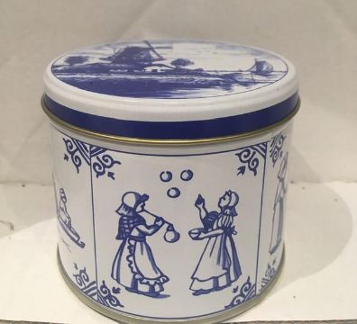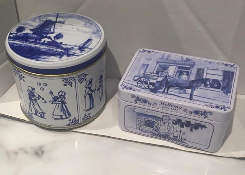 Description : Tin storage tins from Holland, age unknown, displaying folk art and utility scenes.