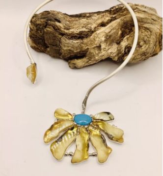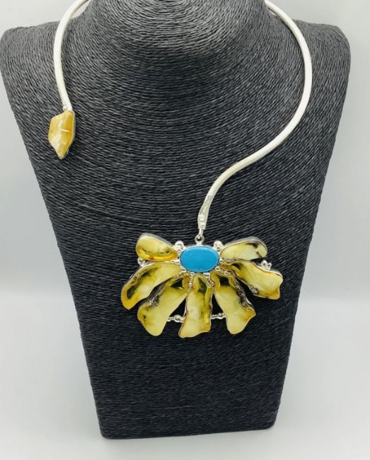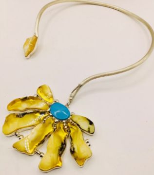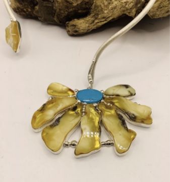 The large flower shaped pendant features an antique turquoise oval centre stone surrounded by antique amber petal shaped stones all set in sterling silver.