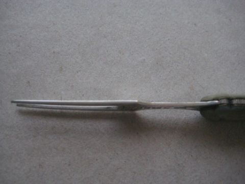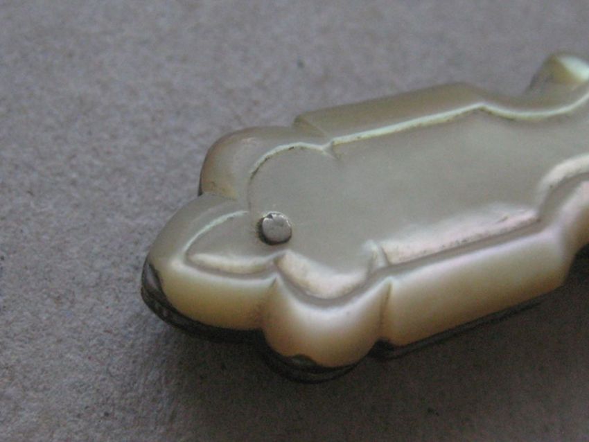 Condition: Good. Very Slight wear to the mother of pearl handle at the very bottom. Blade snaps in and out. Length open is 5.5 Inches.