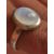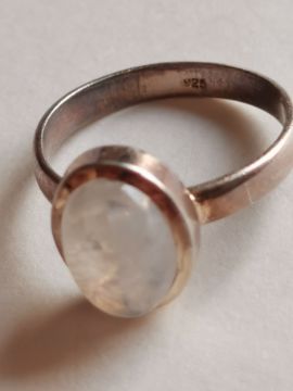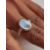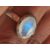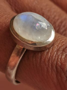 - The stone appears to be a rainbow moonstone, showing a soft milky-white base with flashes of blue iridescence (known as adularescence)