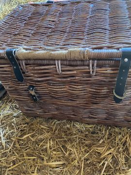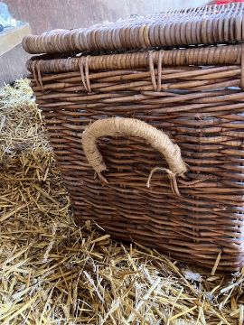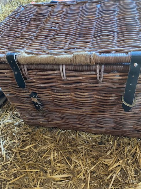 Wicker basket in good condition.Basket cover had a patch as shown sewn on.