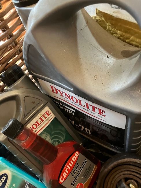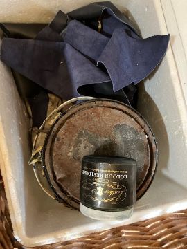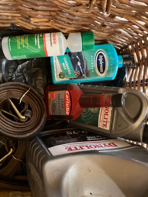 Paint and wax and other items in the basket.