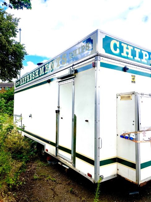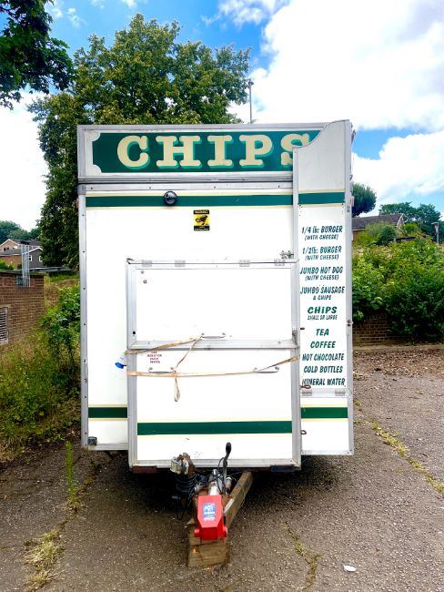 With its classic white-and-green exterior proudly displaying “Chips” and “Refreshments,” alongside versatile branding like “Chubbys Chips & Burgers” and breakfast baguettes, it boasts eye-catching appeal that draws crowds effortlessly.