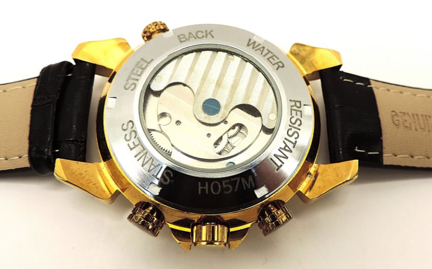 Water Resistant - Stainless Steel Back - Black leather strap.