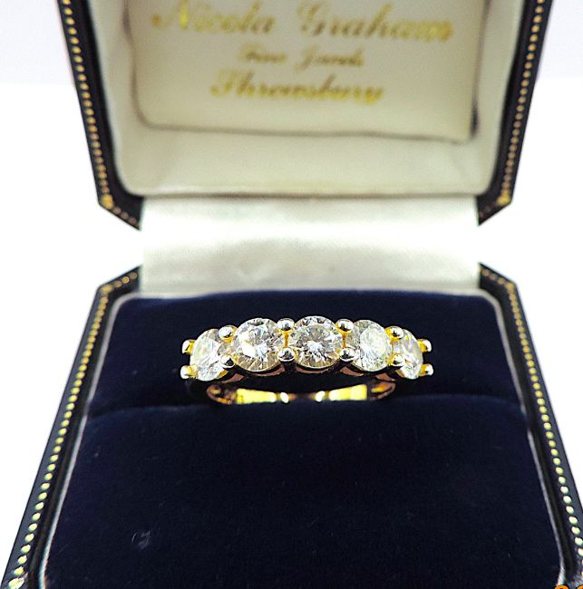 A lovely ring in sterling silver with an 18k yellow gold overlay set with 5 x 3mm sparkling round Moissanite gemstones.