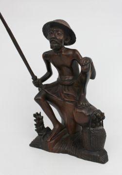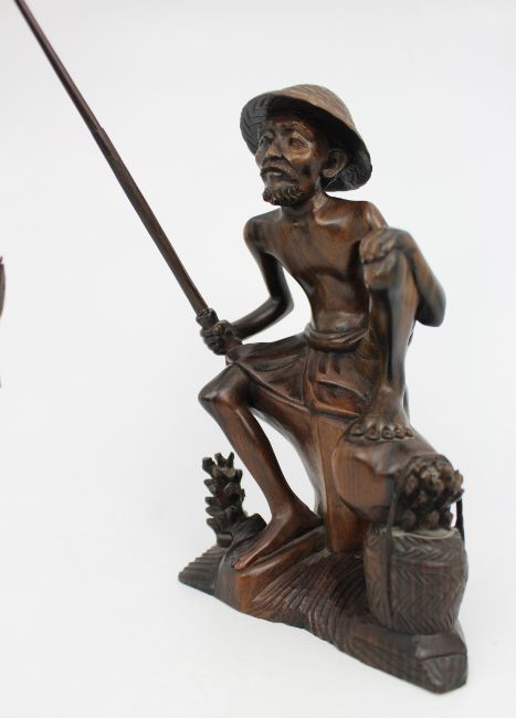 Carved wooden figure of a seated fisherman, likely made in Bali or Java in the mid-20th century.