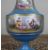 Of baluster form with pedestal foot, the vase is finely hand-painted with reserves including a portrait of a lady in 18th-century dress, a romantic pastoral scene, and floral bouquets.