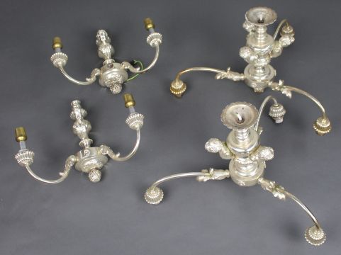 A group of four vintage light fittings comprising two 3-light chandeliers and a matching pair of 2-light wall lights, all of heavy cast metal construction with classical cherub masks, scrolling arms and foliate decoration, finished in a silver-coloured tone.