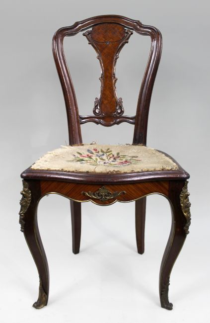 Description: Antique French Kingwood Parquetry Side Chair with Ormolu Mounts