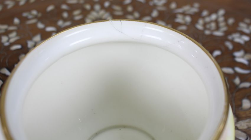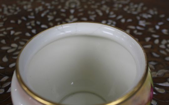 Displays well but with a repaired crack to the rim extending partway down one side, and light age-related crazing throughout.